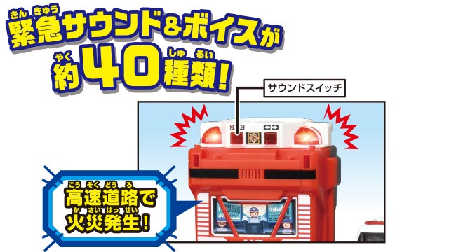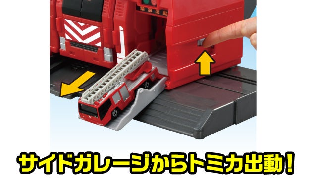 緊急サウンドとともに中央に格納されたビッグファイヤーが出動します。左右のサイドガレージ、内部ガレージの4カ所からトミカが発車可能です。