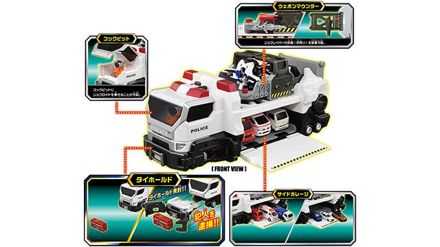前部にあるボタンを押せばタイホールド発射!障害物にぶつかればアームは展開し、すぐさま犯人を逮捕できるぞ!