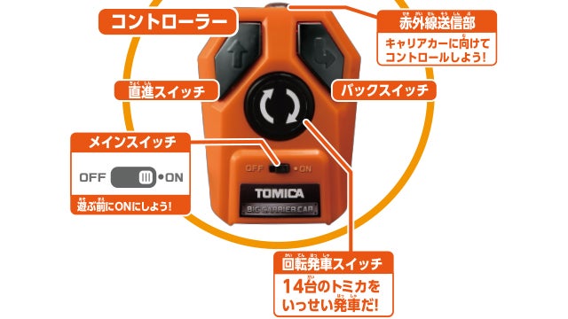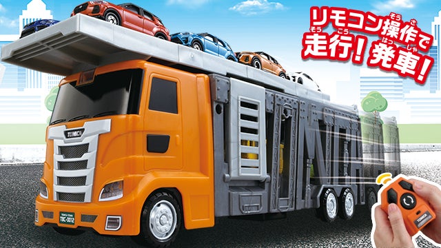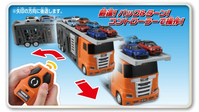 コントローラーを使って走行操作、トミカの一斉発車操作が可能な大きなキャリアカーです。