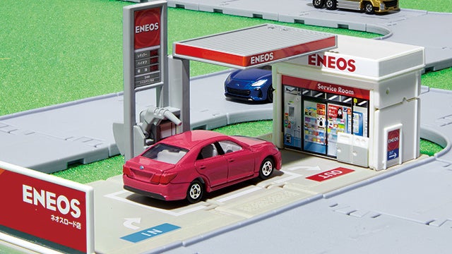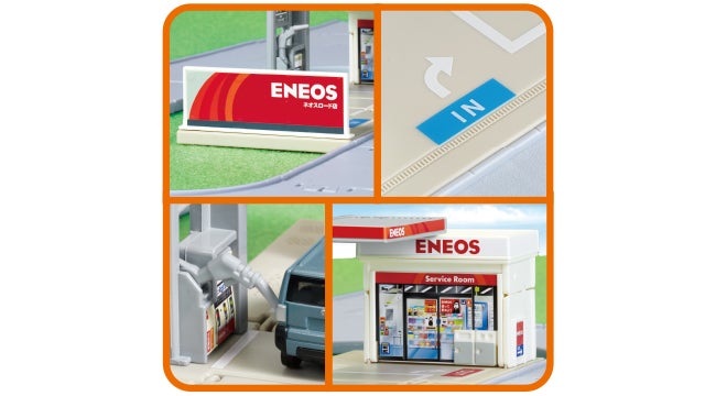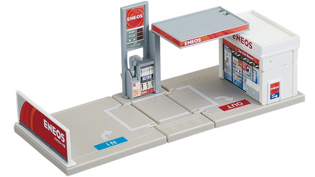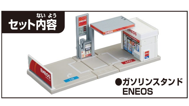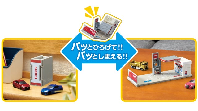 パッと開いてすぐ遊べるトミカタウンにガソリンスタンドENEOSが登場!トミカを停めて給油機遊びが楽しめます。