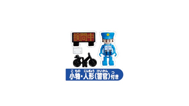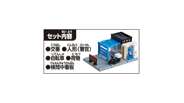 交番はガレージ付き。別売りのトミカを駐車させて一緒に遊べます。警官、自転車、検問中看板など遊べるパーツ入り。警官は自転車に乗せて遊べます。