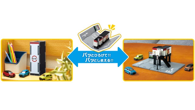 駐車場にトミカを駐車できます。お店の建物は1階建て、2階建てに変形が可能です。
