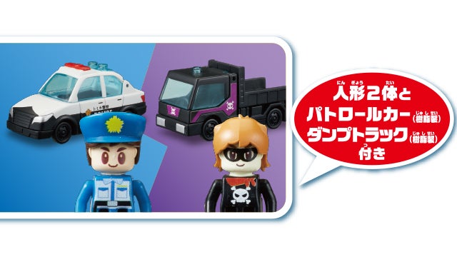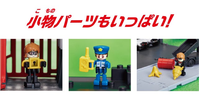 建物や情景パーツの自由な組み替え遊びでキミだけのストーリーをつくろう!警官、悪者の2体の人形とパトロールカー、ダンプトラック付き。