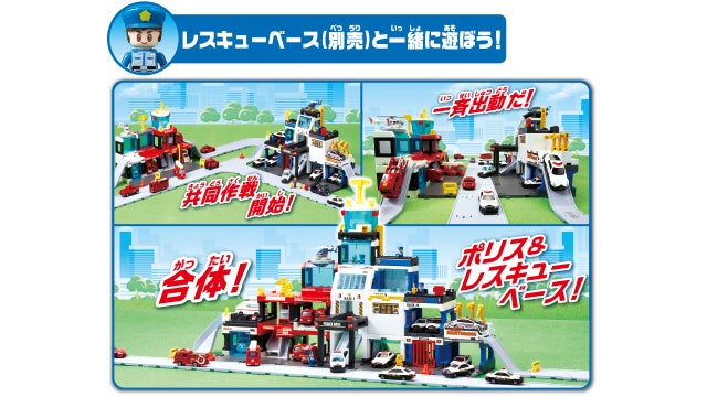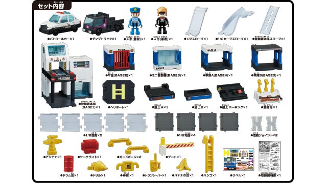 DXポリスベースはトミカを駐車、出動可能な警察署、付属の人形を使って遊べる本部や牢屋、ミニ警察署、整備場などの建物で構成されています。付属のパトロールカーに警官の人形を乗せて出動させ、牢屋を脱獄した悪者がダンプトラックに乗って逃走する後を追跡したり、事件解決に向けた警察ごっこ遊びが楽しめます。