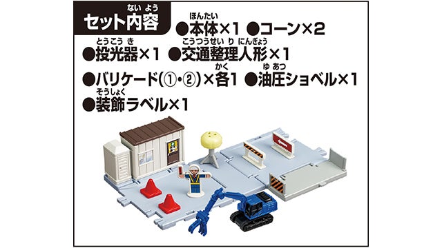 トミカタウンどうろとつながる「どうろ工事現場」と工事現場の情景パーツ(コーン、バリケード、照明灯、交通整理人形)、油圧ショベルグラップル仕様(ブルーカラー)トミカ1台のセットです。