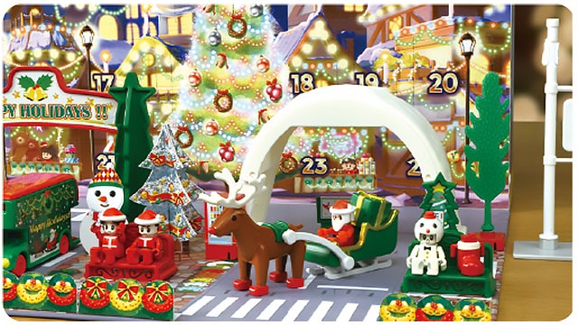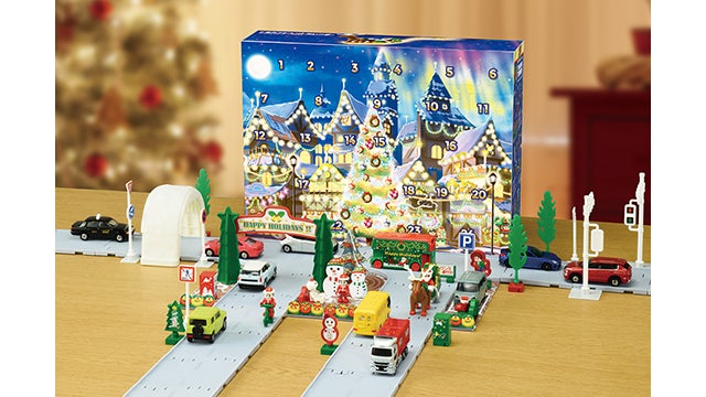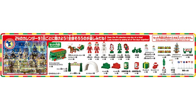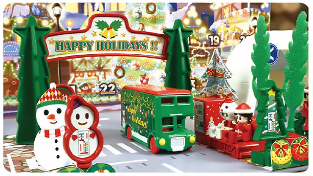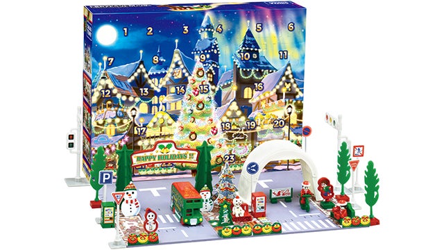 1日ごとに開けて、全部そろうと楽しいトミカタウンが完成します。