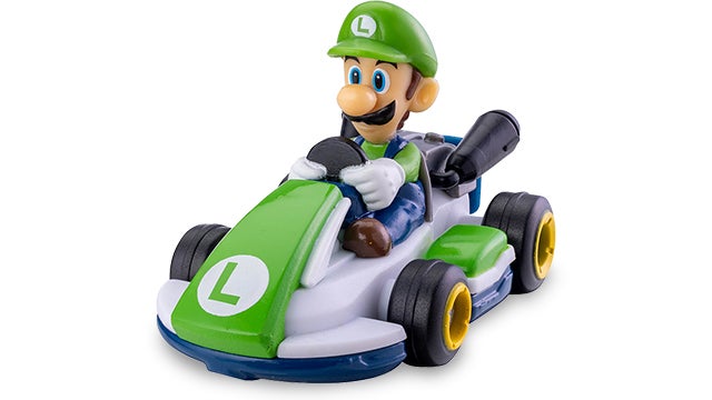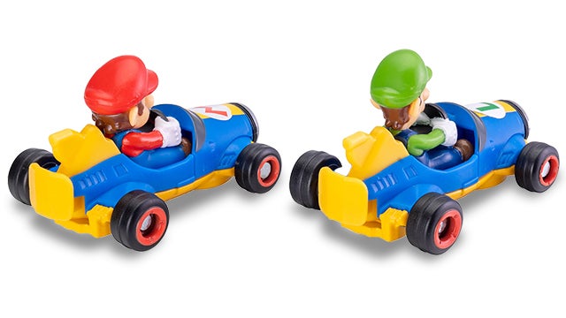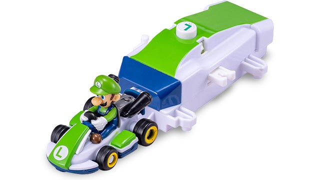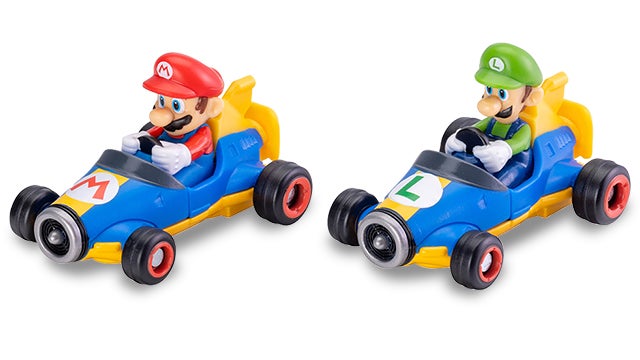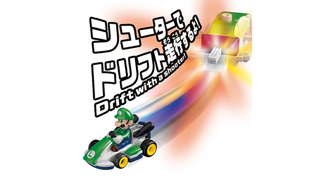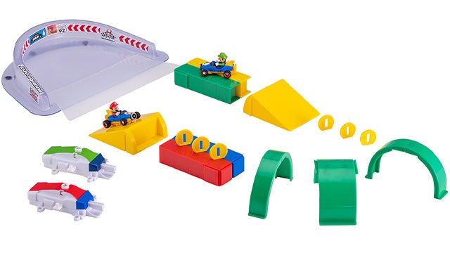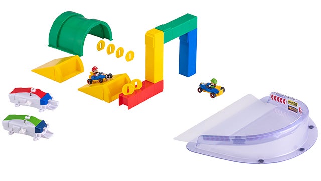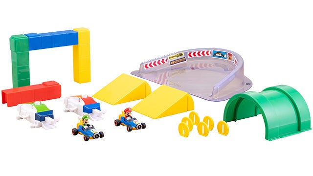 カート2台(マリオ・ルイージ)に、土管トンネルやブロック棒・ジャンプ台・コインなどが付属した、すぐに遊べる対戦セットです。