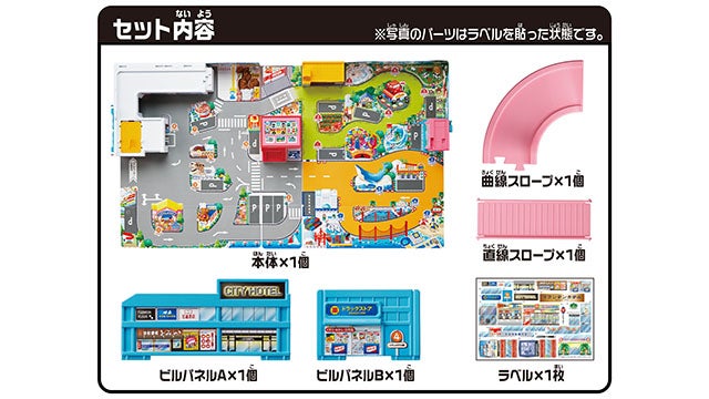 ③マップには立体交差になった駅前繁華街や広々とした郊外や山や海など、様々な情景を表現。トミカを使ったドライブ遊びが充実しています。