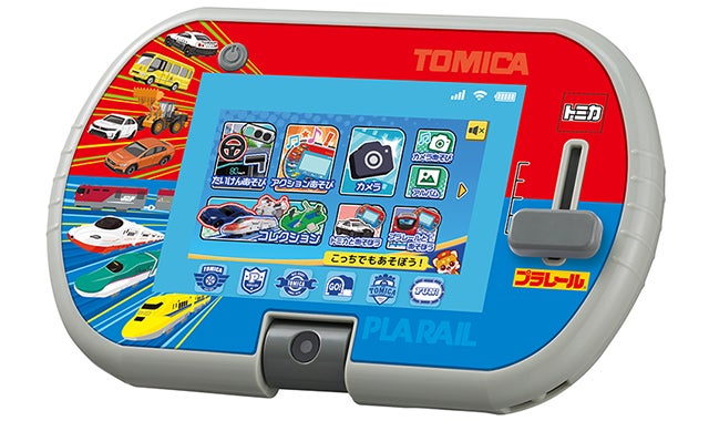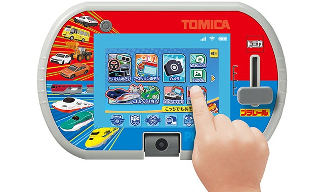 持っているトミカ・プラレールと画面が連動!カメラで撮影したトミカ・プラレールが画面の中に登場するよ!(※トミカ(ミニカー)、プラレール(車両、レール)は別売りです。)