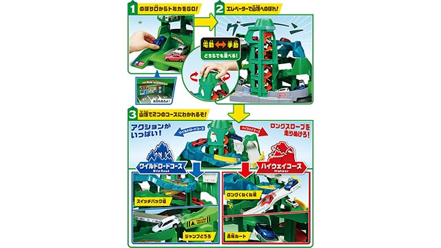 トミカがダブルエレベーターを登って、2つのやまみちコースをびゅんびゅん走りまわります。