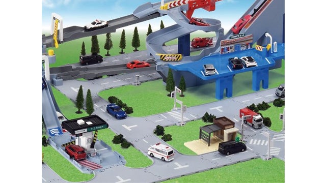 トミカタウンどうろ(別売り)とつなげたり、2024年秋発売予定「2WAYにぎやか高速どうろ(別売り)」とつなげて一緒に遊べます。