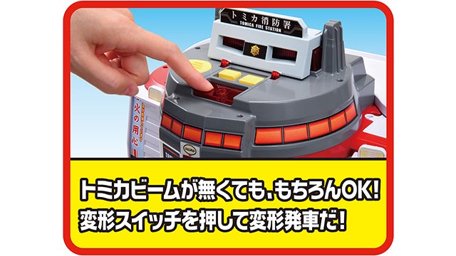 別売のトミカビームから赤外線を受信すると消防署からスクランブル発車モードに変形!