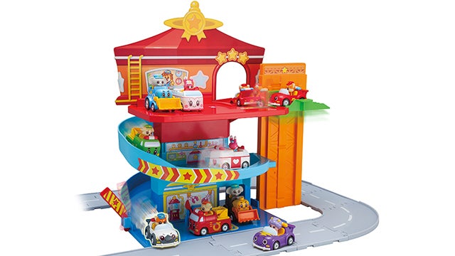 中央コアには12台のトミカが格納可能。消防署モード時は手動操作でトミカを発車できます。