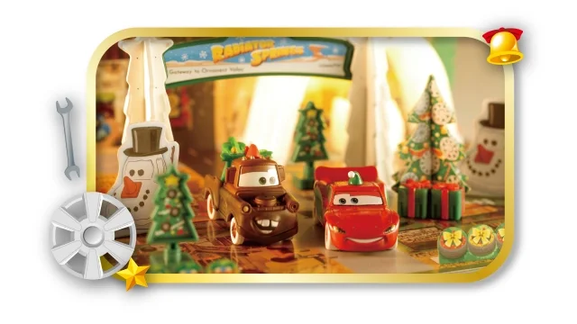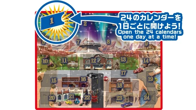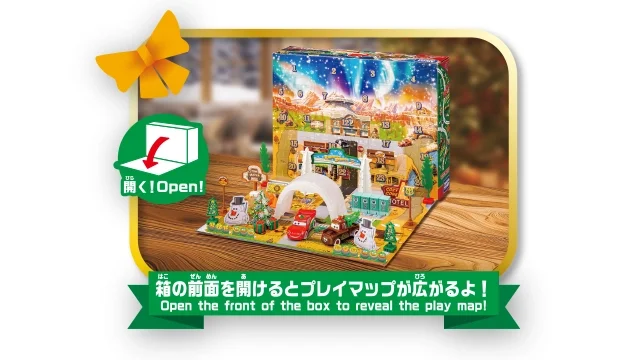 箱の前面を開くとプレイマップが広がり、カレンダーを1日ごとに開けて、全部そろうと楽しいカーズの世界が完成します!