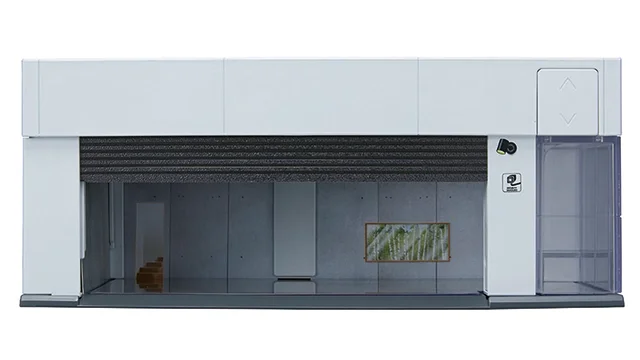 操作パネルをタッチすると、電動シャッターが本物のようにゆっくり開閉し、ガレージ内が自動で点灯/消灯します。