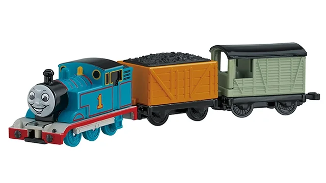 トーマスの顔、車体のカラーリング、貨車も絵本仕様の特別なカラーリングです。