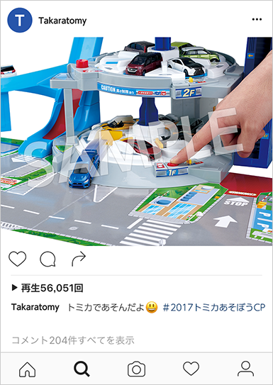 自主投稿用のハッシュタグ「 #2017トミカであそぼうCP 」をつけてご自身のアカウントに投稿してください。ハッシュタグの前後には半角スペースが必要です。