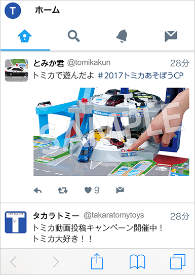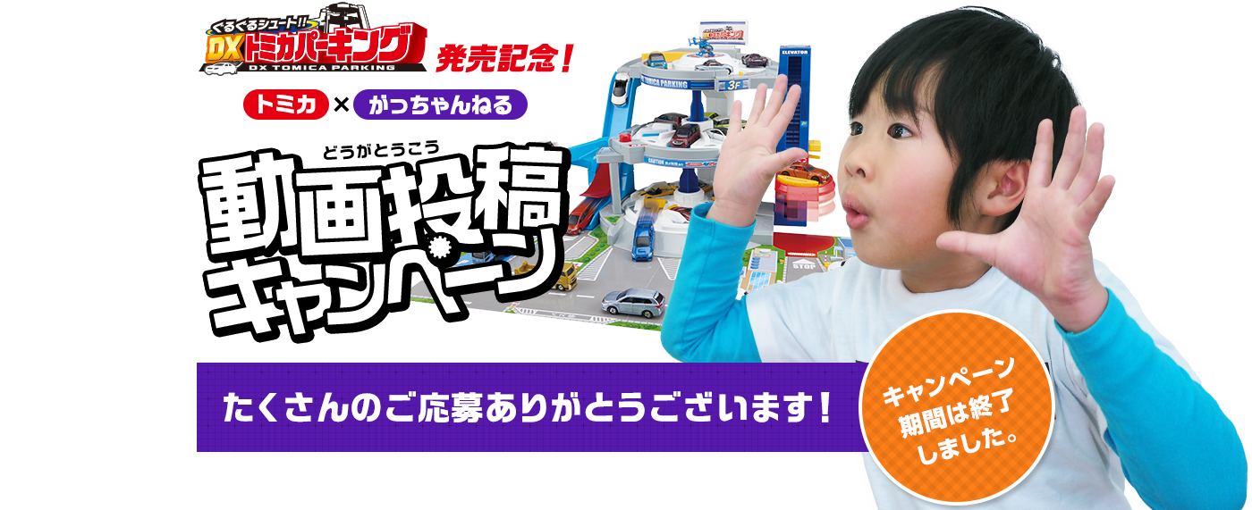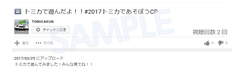 動画のタイトルの最後に「 #2017トミカであそぼうCP」をつけて、ご自身のYoutubeアカウントから動画をアップしてください。