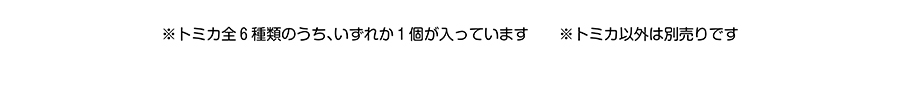 トミカ全6種類のうち、いずれか1個が入っています。トミカ以外は別売りです。