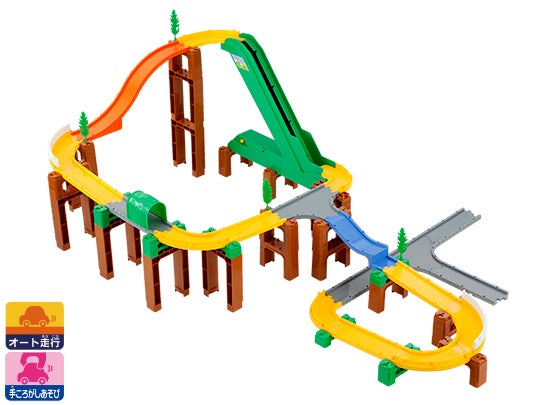スロープに戻るか、平面どうろの広がるコースへいくか選べるコース。 やまか、ふもとか、高低とオート、手動を切り替えて楽しめる!