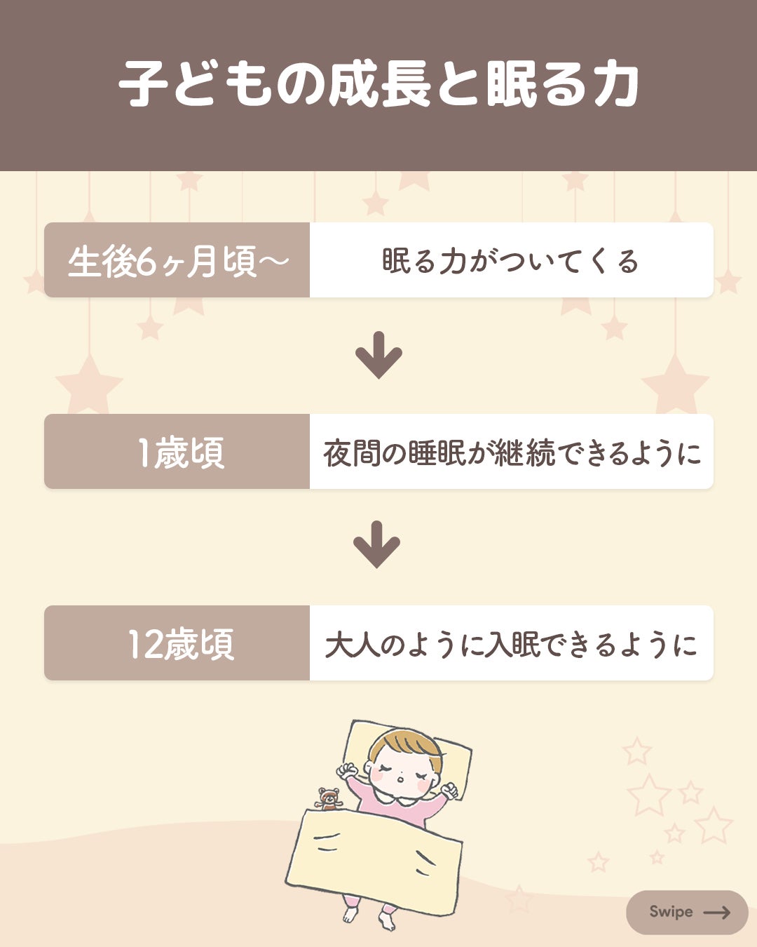 なかなか寝ないとクタクタになってしまいますよね。でも、子どもは成長に伴い、「眠る力」がついてくるんです。