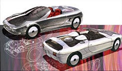 SPIDER"は液体水素を用いたレシプロエンジンをミッドシップに配し、現在のガソリン車と同様のドライブトレーンを持つコンセプトモデルである。エクステリアは、トミカサイズでプレゼンテーションするためにオーソドックスなシェイプと明快なグラフィクを組み合わせた。広いグラステリアはソーラーセルを兼ね、エンジンを停止していても車載コンピュータに充分な電力を供給する。(カトキハジメ氏談) |