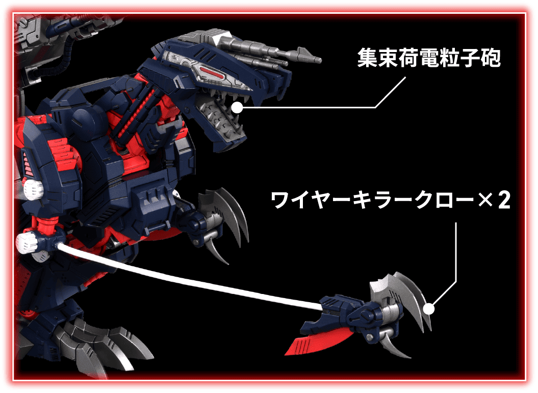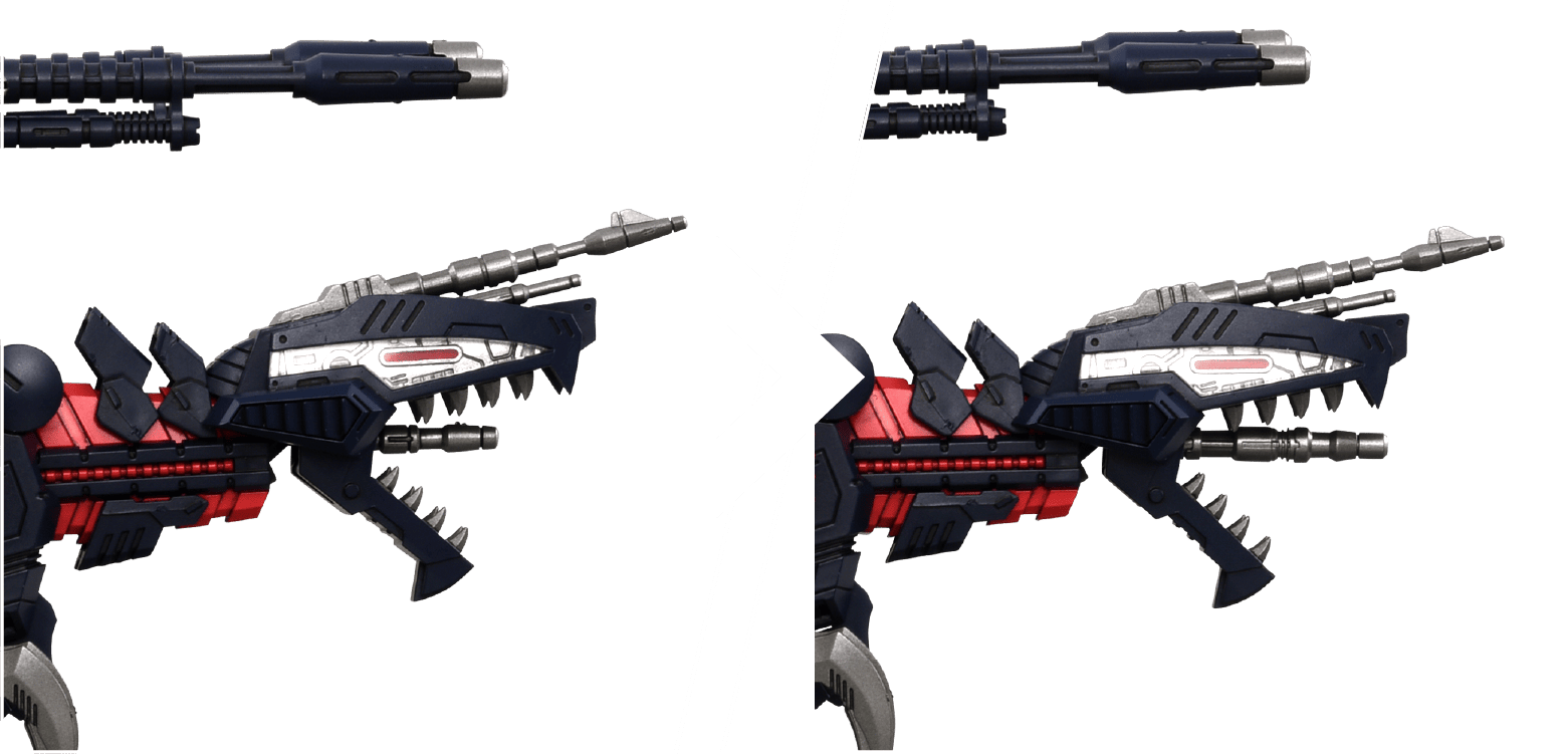 リアライズモデル第2弾のジェノザウラーから可動域やプロポーションを損なうことなく、劇中通りに前腕が射出されるワイヤーギミックの分割を実現。 また一部パーツの配色変更も行い、カラーリングの再現度もさらに高めている。