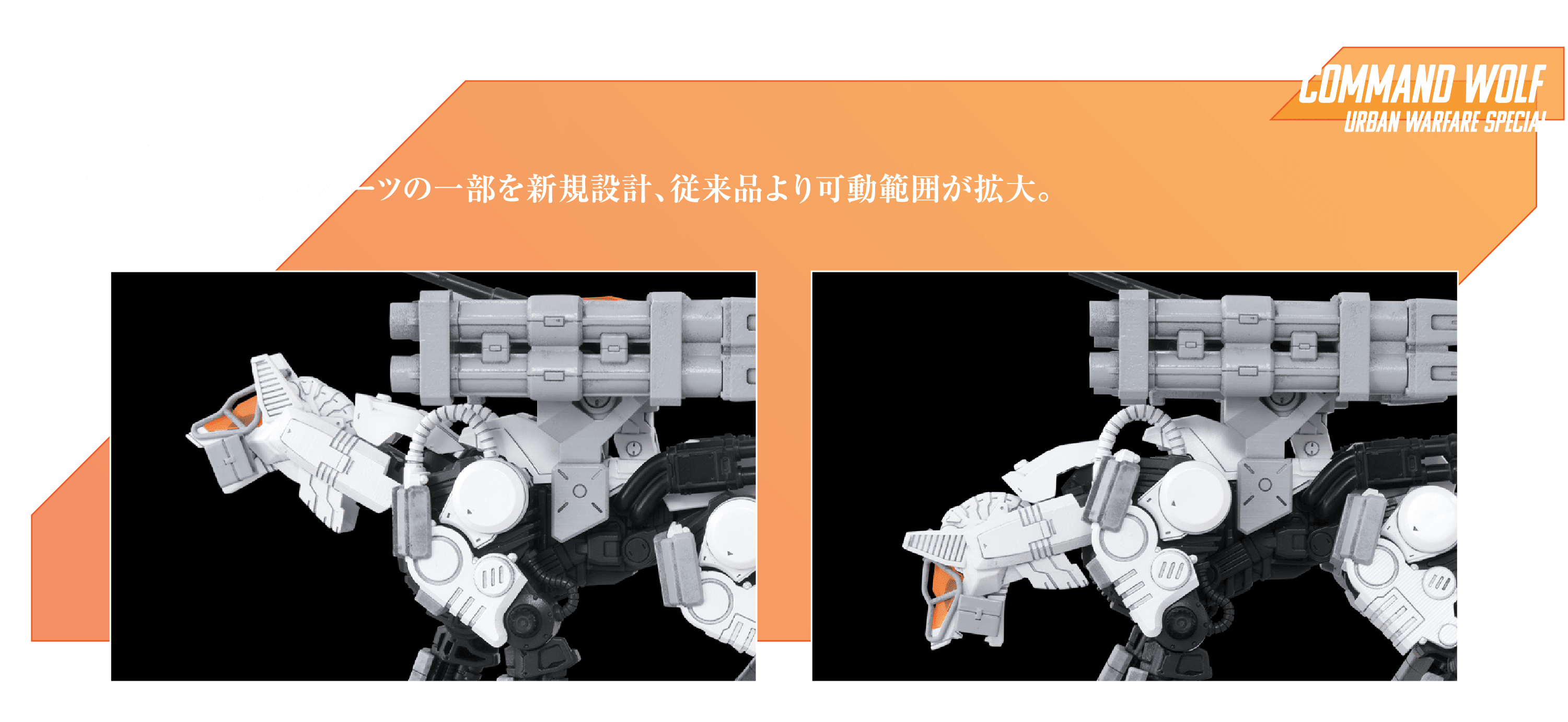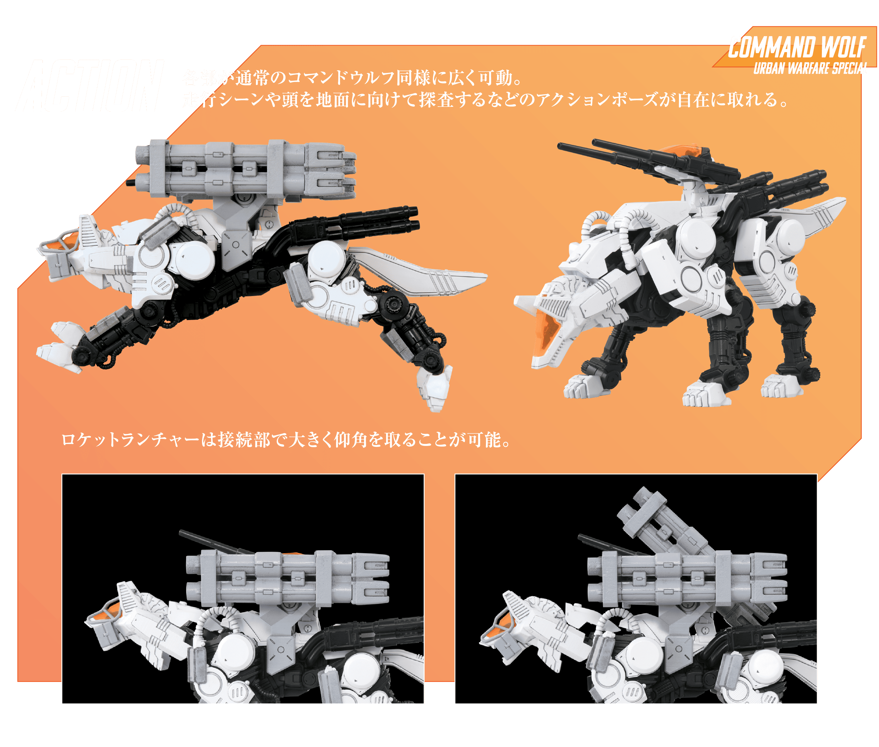 タカラトミーのゾイドシリーズとして初のキット化を実現。アニメ劇中の再現度を突き詰めた”コマンドウルフ市街戦仕様”。