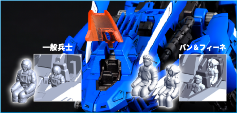 コックピットハッチの開閉ギミック、さらに1/100スケールのパイロットフィギュア(バン&フィーネ・一般兵士)が付属!