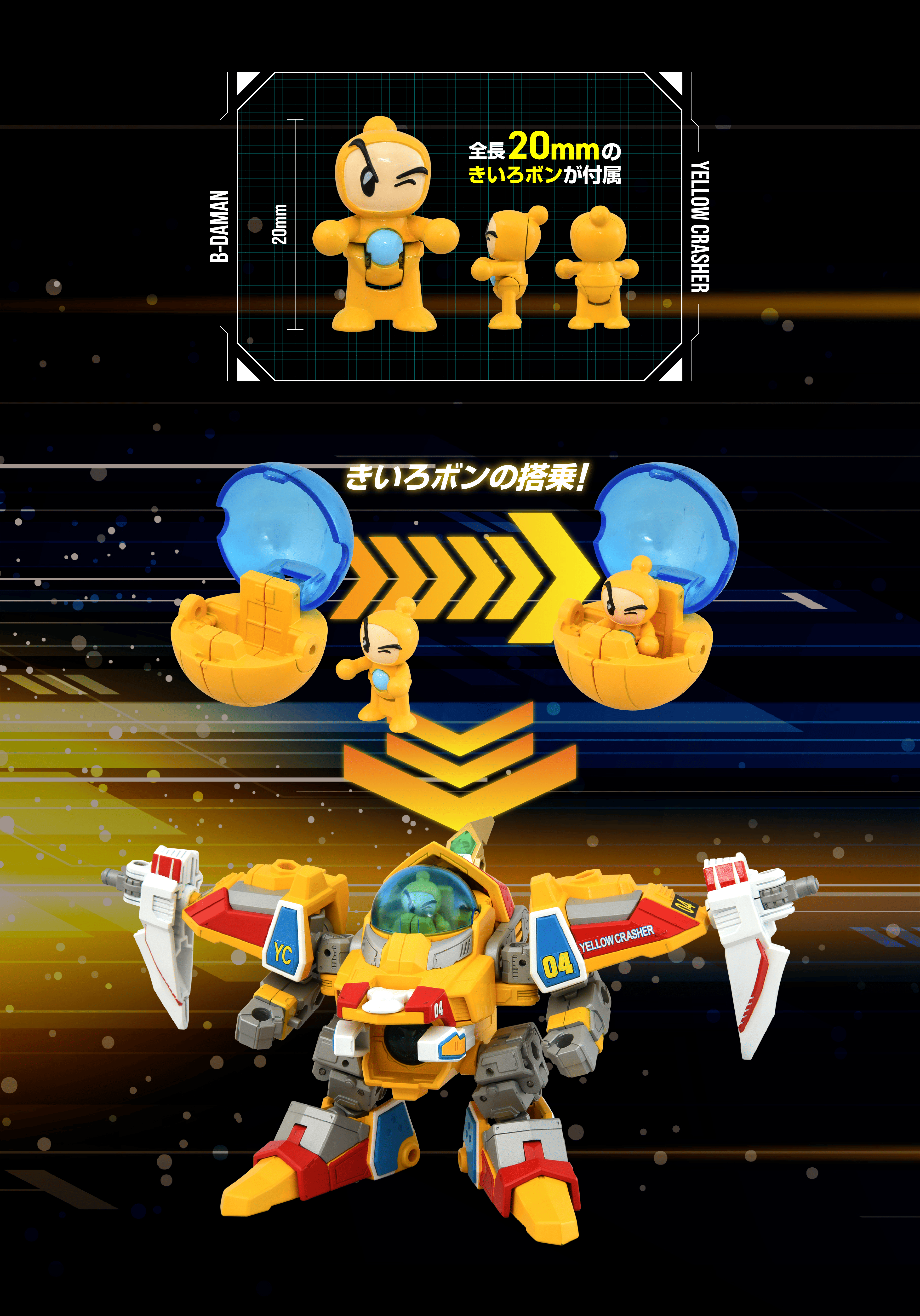 コックピットである「ビーダカプセル」を商品に同梱。当時品同様に頭部へ取付ライドモードが完成。パイロットの「きいろボン」フィギュアが搭乗可能!