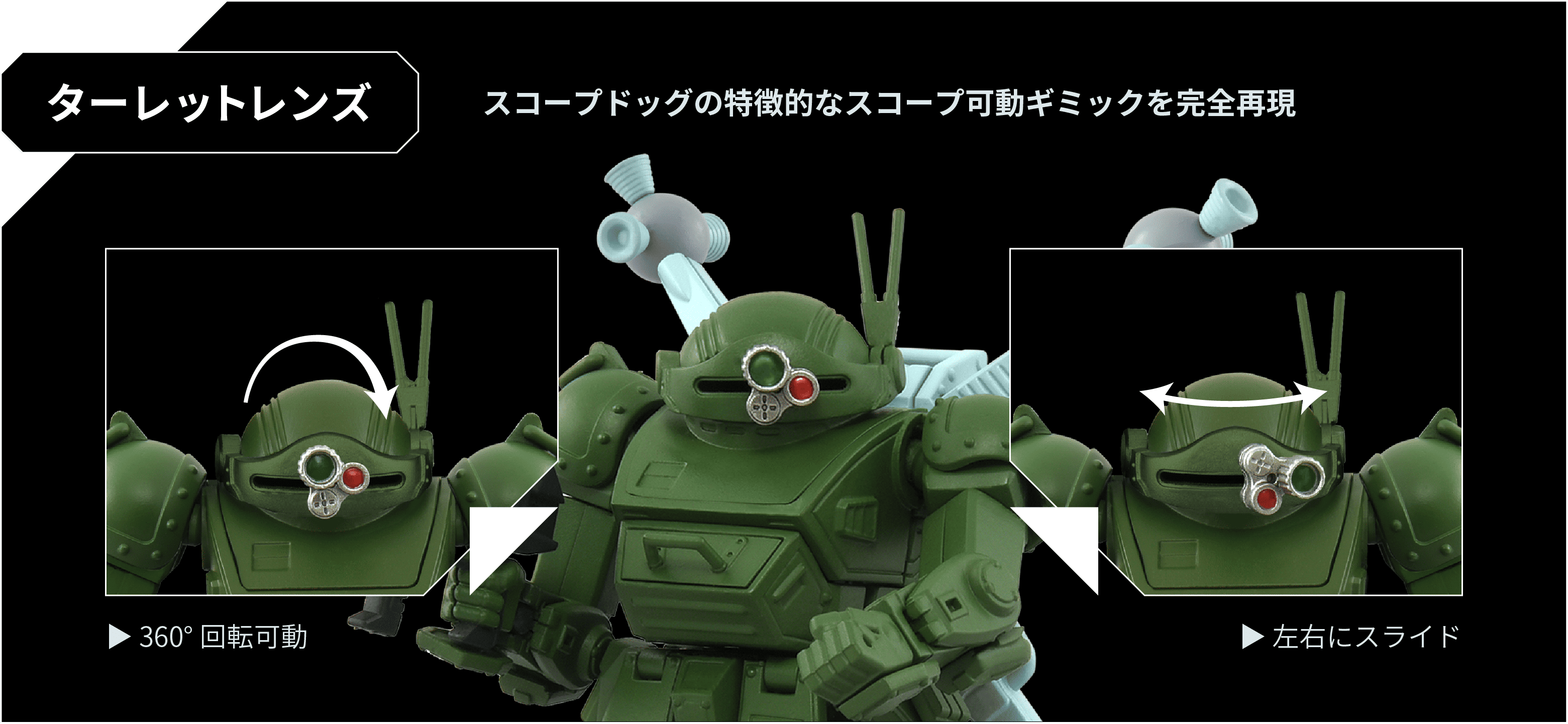装甲騎兵ボトムズTVシリーズ第29話より登場した謎の戦艦X艦内に搭載されていたラウンドムーバー装備の宇宙戦仕様のスコープドッグを再現。武装はソリッドシューターとショートバレルのヘビィマシンガンが付属。