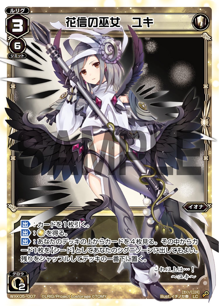 【出】:あなたのデッキの上からカードを4枚見る。その中からカード1枚を【シード】としてあなたのシグニゾーンに出してもよい。残りをシャッフルしてデッキの一番下に置く。