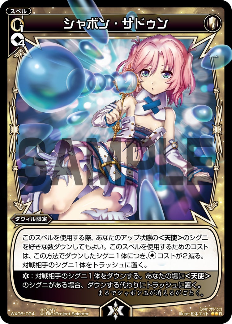 2.コストを支払う前に、自身のアップ状態の<天使>のシグニを好きな数ダウンさせることが出来ます。これによってダウンさせた<天使>のシグニ1体につき、《シャボン・サドゥン》のコストを無×2減らす事が出来ます。