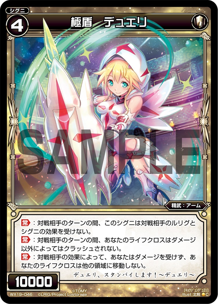 - 【ランサー】によるクラッシュはダメージではないため、2番目の常時能力により防がれクラッシュされません。ただし、【ランサー】を持つシグニとのバトルで《極盾 デュエリ》自身がバニッシュされた場合は、ライフクロスがクラッシュされます。