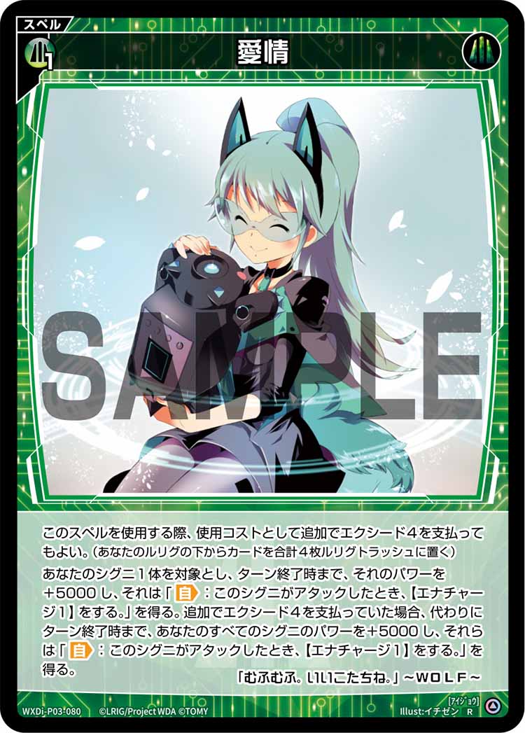 :このシグニがアタックしたとき、【エナチャージ1】をする。」を得る。追加でエクシード4を支払っていた場合、代わりにターン終了時まで、あなたのすべてのシグニのパワーを+5000し、それらは「