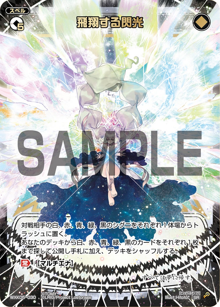 対戦相手の白、赤、青、緑、黒のシグニをそれぞれ1体対象とし、それらをトラッシュに置く。