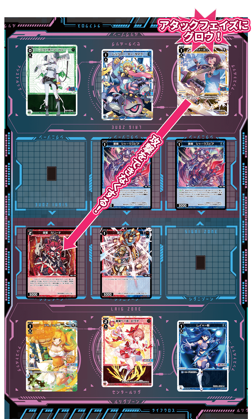 最後は、アキノが残りのデッキからカグツチが出ることを確信し、アダマスフィアのアタック効果(シグニにアサシンを付与)を発動していき、フィニッシュになります。