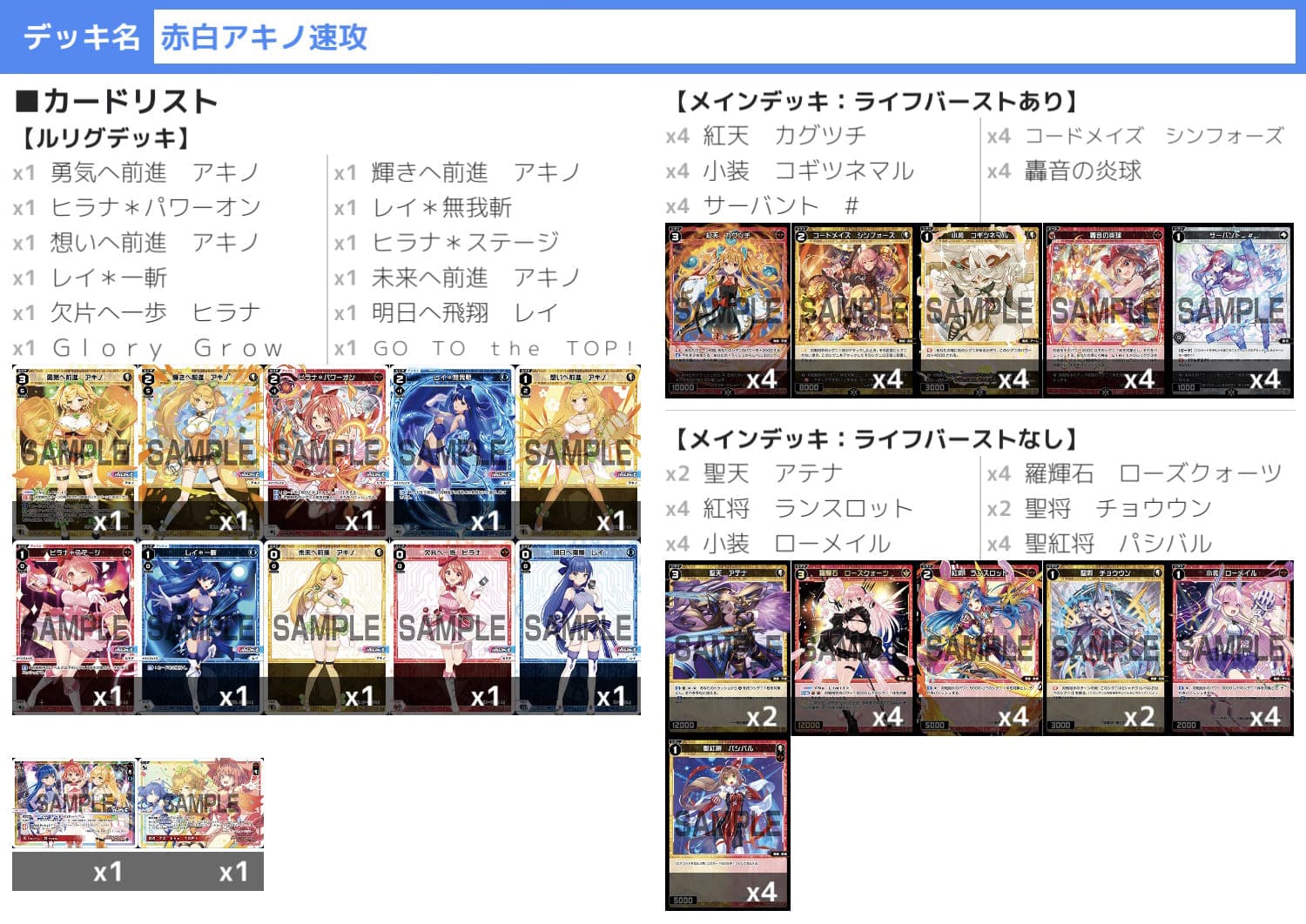 ヒラナのアシストとアキノのゲーム1効果を活かすために赤白の速攻に寄せた構築にしました。