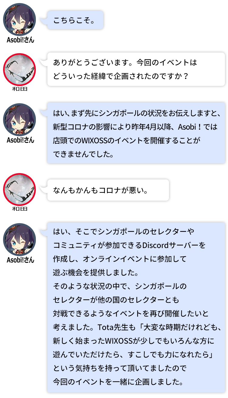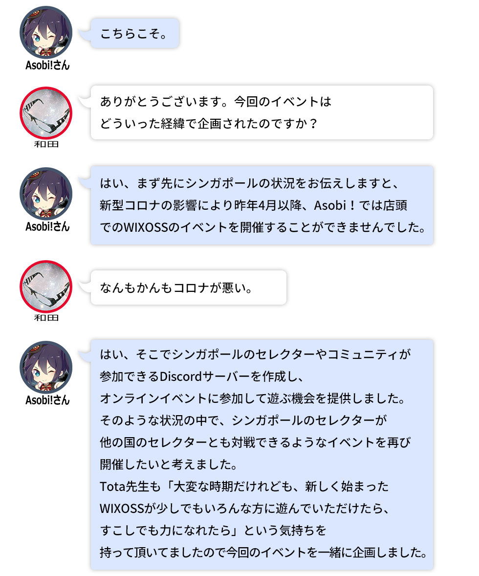 なにやらこちらのイベント、ウィクロスのイラストを担当されているTota先生と、シンガポールのお店さんが共同で企画されたイベントとのことです。とても気になるのでお話を伺ってみましょう!