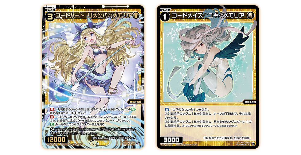 メモリーシグニの《コードハート リメンバ//メモリア》の1つ目の能力は《星占の巫女 リメンバ・ナイト》そのものですし、《コードメイズ ユキ//メモリア》も、ユキが得意とする「能力を失う」「シグニの移動」をそのまま再現しています。