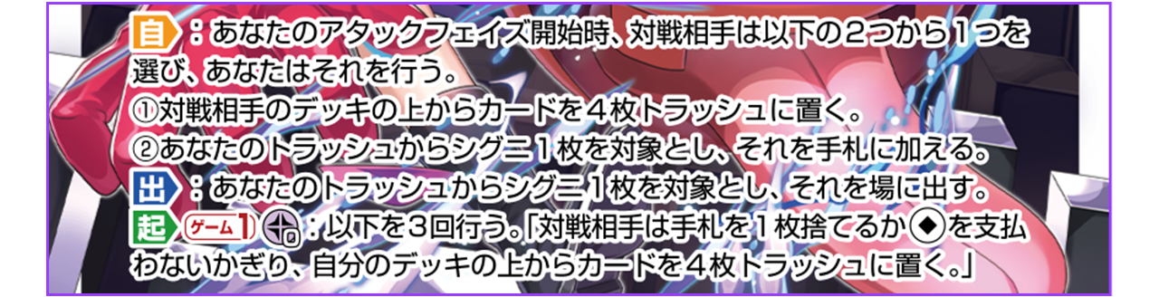 毎ターン相手に選んでもらう自動効果、自分にとっては①相手のデッキを削れる②トラッシュにいる好きなシグニを回収できるからサーバントだって回収できるかも!