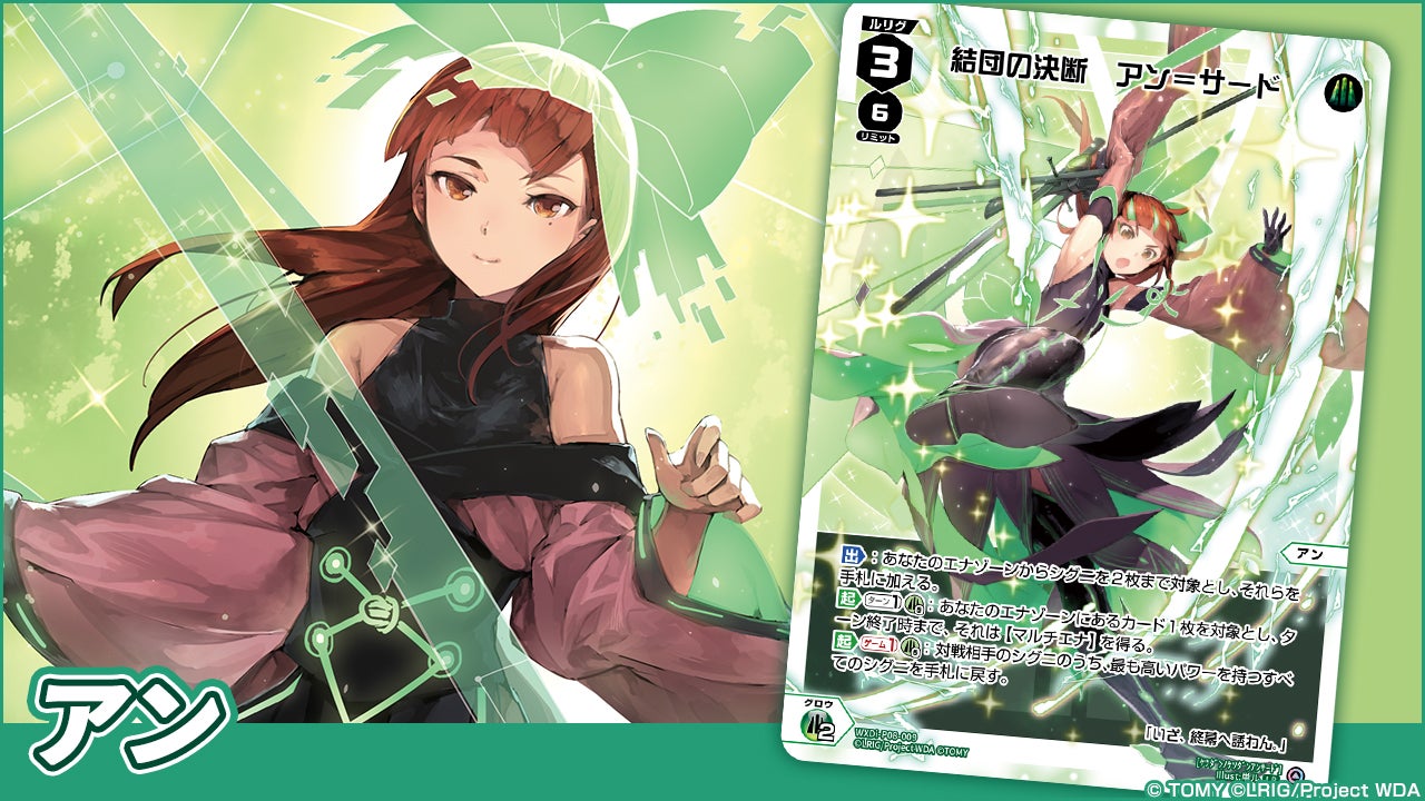 - 「アン」は「マルチエナ」の生成と回収効果により、幅広い戦略を組み込める対応力が特徴的だ。ゲーム1能力は相手の最大パワーのシグニをすべて除去でき、対象を取らず手札に戻す性質から様々な耐性効果を突破できる点が優秀と言える。