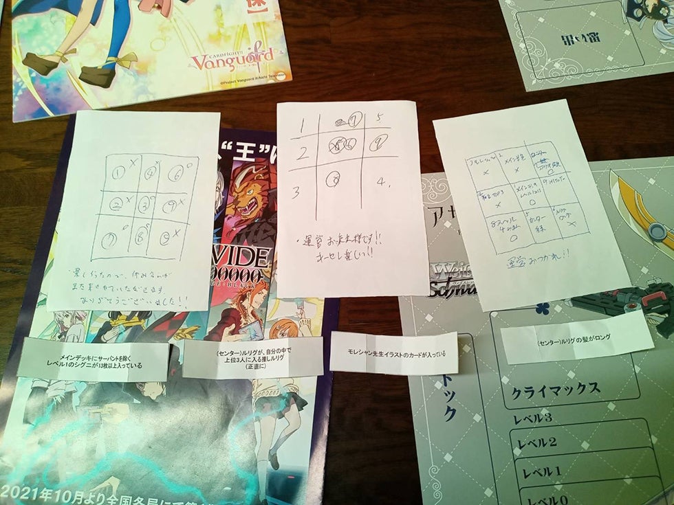 ミニゲームその2、WIXOSSデッキビンゴ。テストプレイ時点では難易度高すぎて誰もビンゴできないのではと心配しましたが、意外と皆さん爆速でビンゴまで持っていってましたね。次はもっと難しくします。