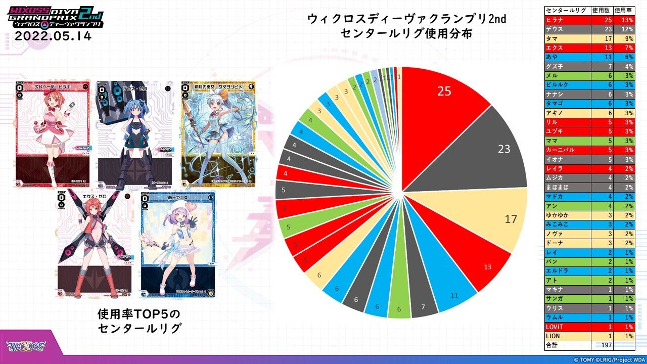 また、使用者数が6番手以降のルリグの人数は団子状態で、誰と当たってもおかしくない環境でもあります。197人の参加者のうち、使用率6位以下のデッキを選択した人は108名。その割合は53%にもなります。「1つのデッキタイプが分布の半数以上を締める」ことが非常に少ないのも、『ウィクロス』ならではの特徴でしょう。