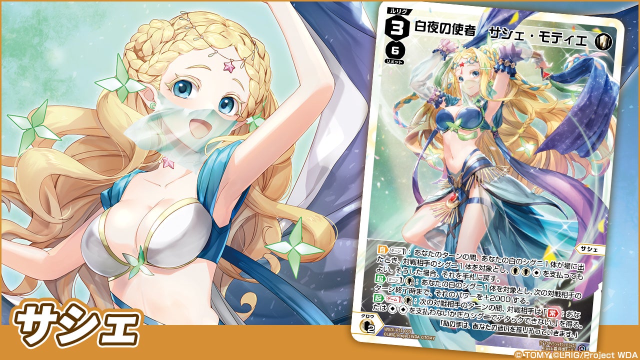 - 「サシェ」はパワー上昇能力と除去能力を持ち、シグニによる攻防に長けたルリグだ。ゲーム1能力は相手のシグニがアタックするたびに2エナの支払いを要求し、グロウしたターンに使えば次の相手の攻めを大きく抑制できる。