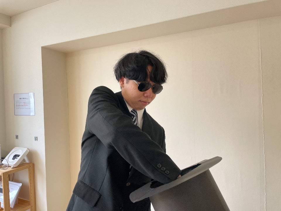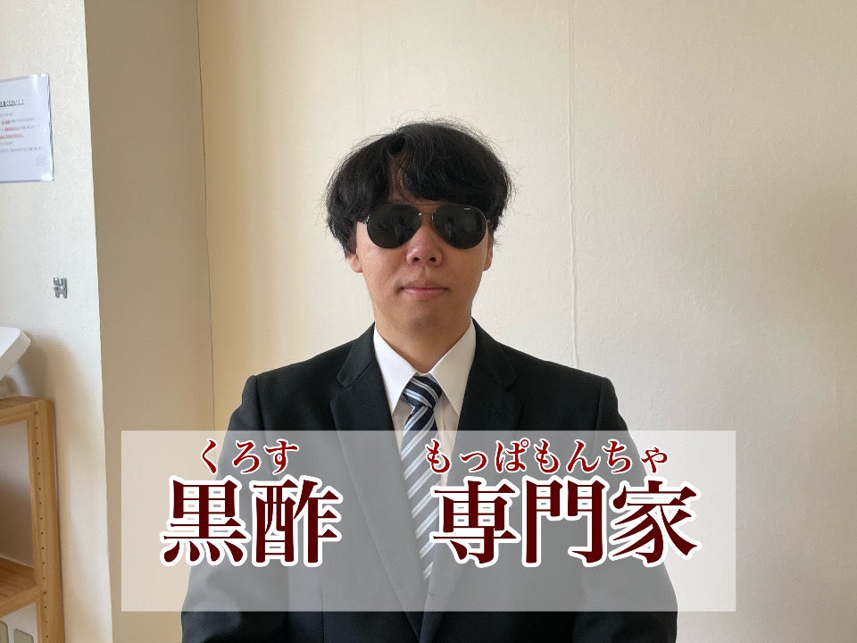 こちらの方は黒酢専門家 (くろす もっぱもんちゃ)さん!いくつもの黒酢に関する論文を個人的に書いており、中でも「両手に黒酢のビンをもつと手がふさがってたいへん不便」ということを発見した“シザーハン酢理論”はご自身いわく「過去イチ」だそうです!