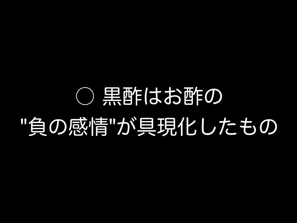 - 一部のお酢たちは人知れず負の感情を蓄積していき、やがて黒く変色しました。それが黒酢が黒い本当の理由です