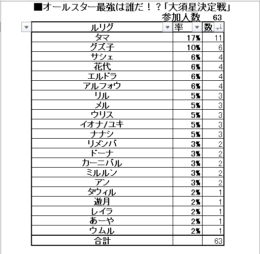 圧倒的なシェアを誇ったのは、オールスターの象徴と言える主人公ルリグ「タマ」で、続く「グズ子」に対してほぼダブルスコアを付けています。