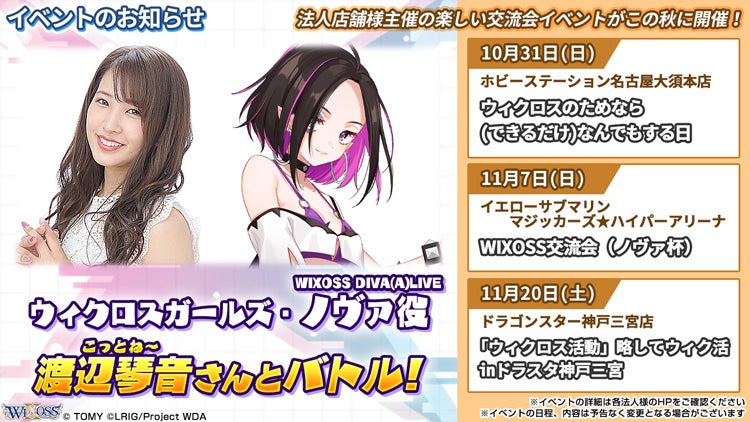 各イベントでは、ウィクロスガールズ・WIXOSS DIVA(A)LIVE ノヴァ役の渡辺琴音さんがゲストとしてお越しいただきます!