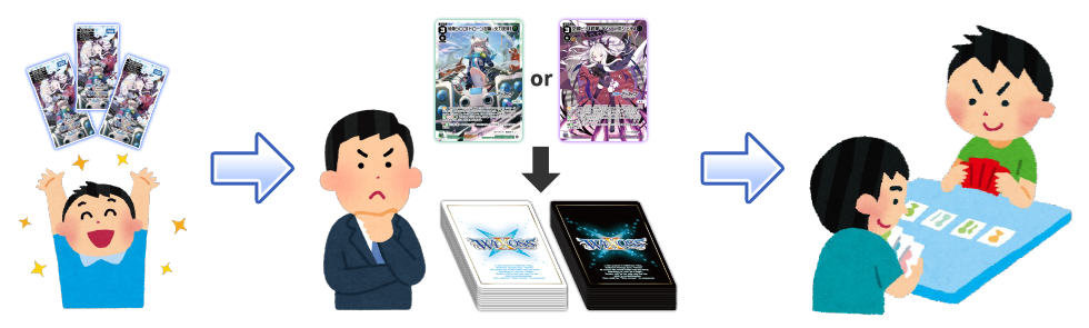 受け取ったパックと、支給されたカードで組んだデッキでバトル!